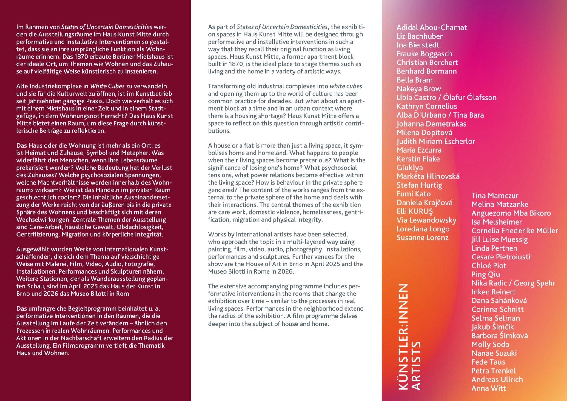 Participating artists: Adidal Abou-Chamat, Tina Bara / Alba D’Urbano, Aneta Beranová, Ina Bierstedt, Jens Brand, Bettina Carl, Vilém Duha, Judith Miriam Escherlor, Kerstin Flake, Gluklya, Vendula Chalánková, Andreas Koch, Pauline Kraneis, Susanne Kutter, Loredana Longo, Susanne Lorenz, Isa Melsheimer, Silvina Der Meguerditchian, David Možný, Linda Perthen, Ahmed Ramadan, Inken Reinert, Tamara Spalajković, Nanaé Suzuki, Petra Trenkel, Gabriele Worgitzki