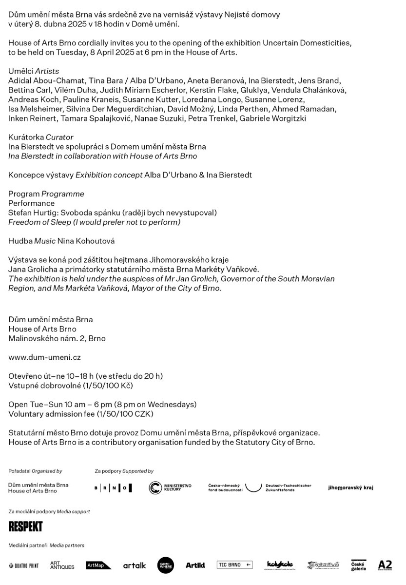 The international exhibition Uncertain Domesticities is a collaboration between the House of Arts Brno, the Berlin-based gallery Haus Kunst Mitte and the Berliner Asyl der Kunst Stiftung Foundation. Two of these institutions have the word "house" in their names, and the diversity of images and meanings of "house" and "housing" in contemporary art has become one of the cornerstones of this project. It was initiated by the Italian curator and multimedia artist Alba D'Urbano and the German painter and curator Ina Bierstedt.